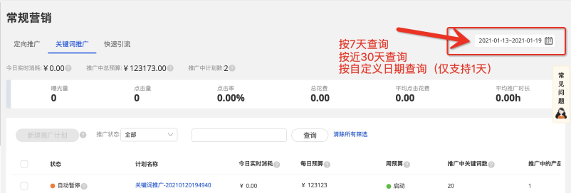 您可以通過(guò)現(xiàn)有計(jì)劃列表,篩選時(shí)間周期來(lái)查看近7天、30天、以及自定義近1天,查看對(duì)應(yīng)數(shù)據(jù);