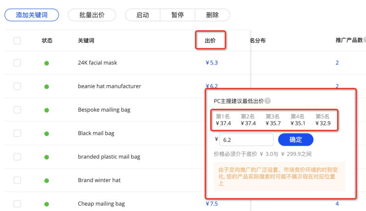 會(huì)根據(jù)關(guān)鍵詞當(dāng)前的競(jìng)爭(zhēng)數(shù)據(jù),給到您進(jìn)入PC主搜的建議價(jià)格,您在當(dāng)前界面設(shè)置完畢價(jià)格后,點(diǎn)擊確定即可;
